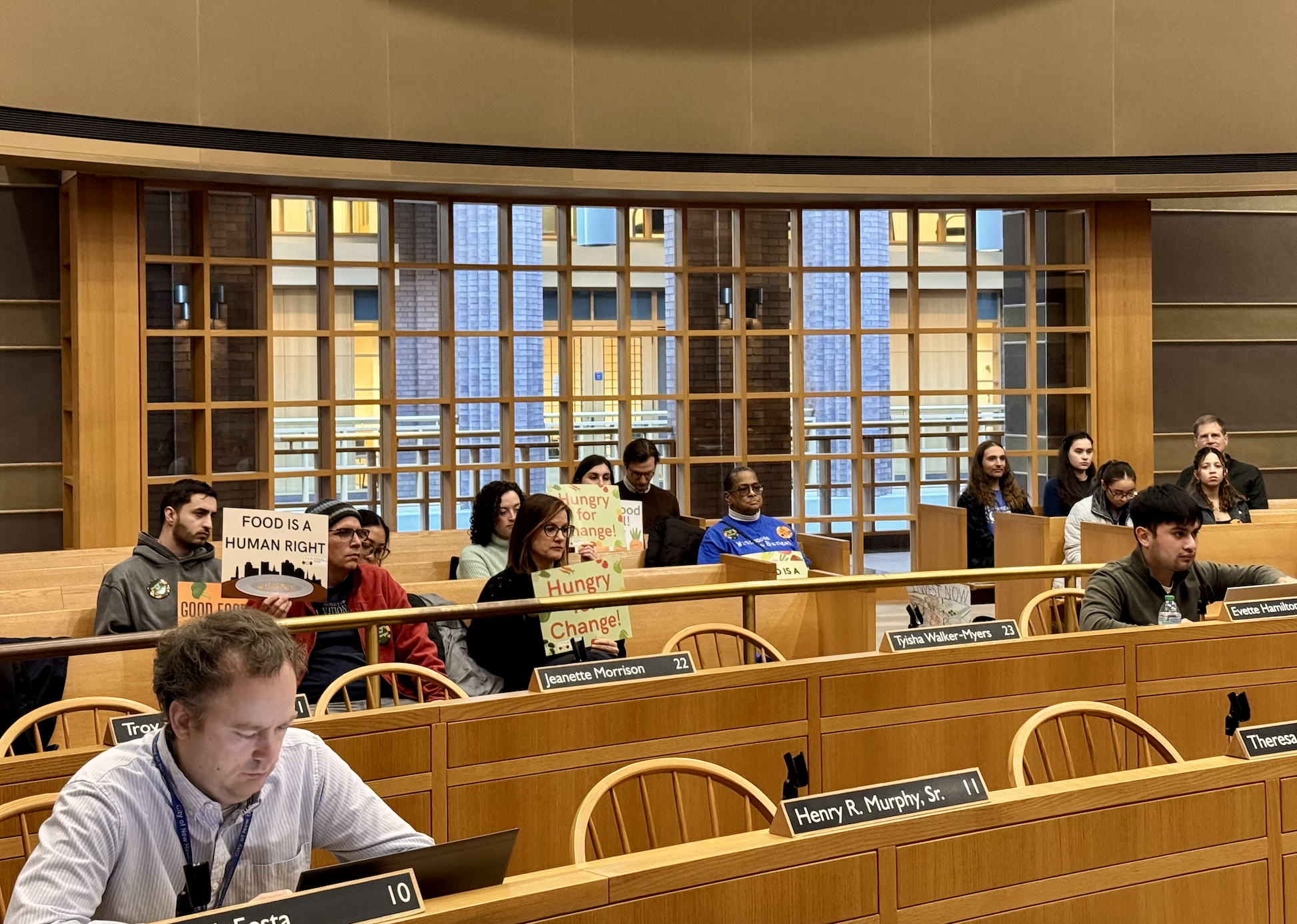 About a dozen food assistance advocates attended Wednesday’s aldermanic meeting. Four of them testified directly to the alders, and some held signs saying, “FOOD IS A HUMAN RIGHT” or “Hungry for Change!”