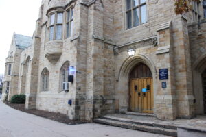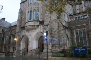 The front of Sterling Library from Cross Campus.