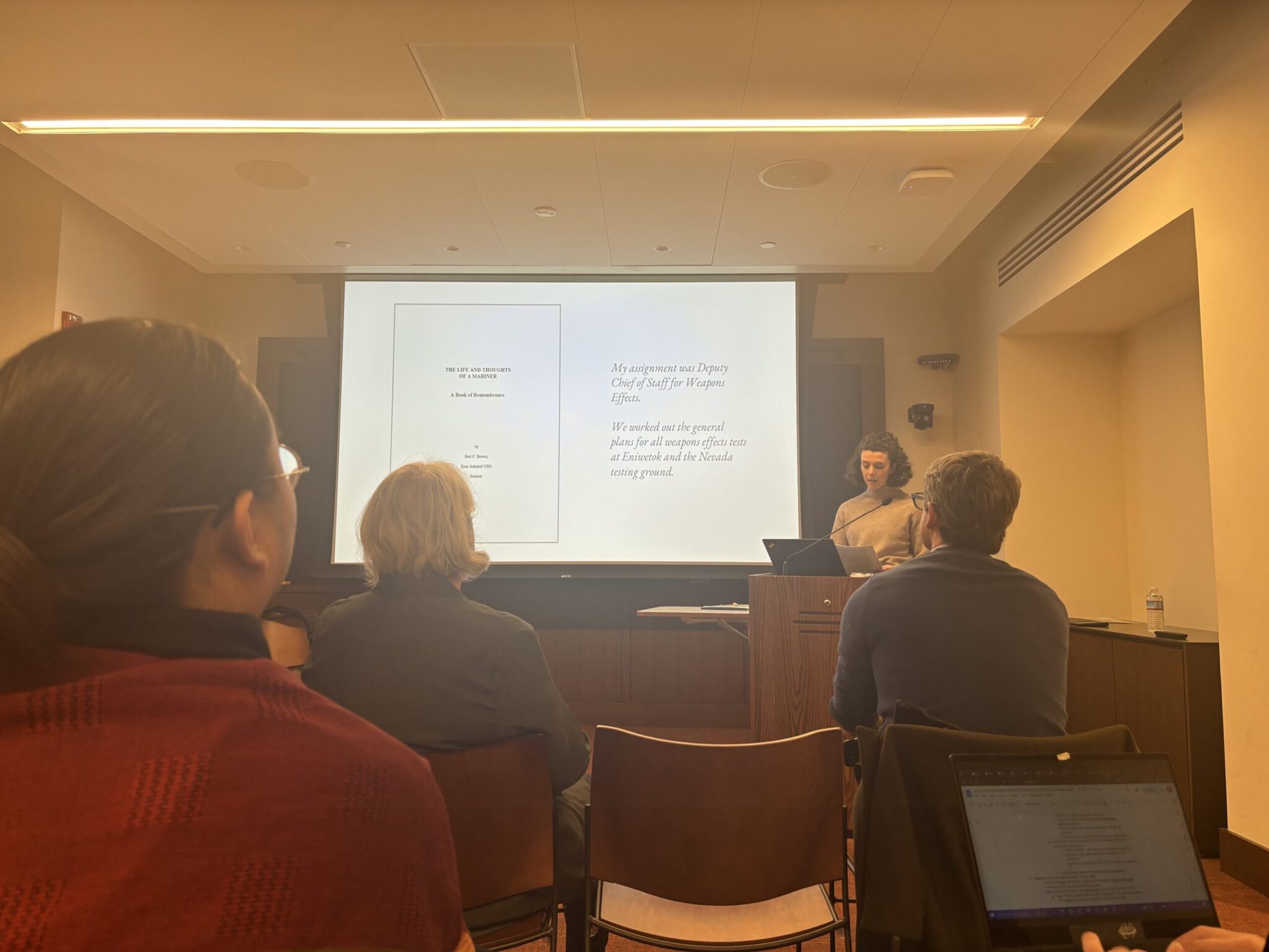 Finally, Hecht presented the enlightenment she gained through reading the memoirs passed on by her great-grandfather, U.S. Navy Captain Bert F. Brown. A graduate student in American studies, Hecht is completing her dissertation, which sprung from the implications of the United States’ history of nuclear testing in different locations, including Nevada and the Marshall Islands, throughout the Cold War, and focuses more broadly on the U.S. nuclear industry. Little did she know that her own family tree also contained a surprising connection to nuclear testing.