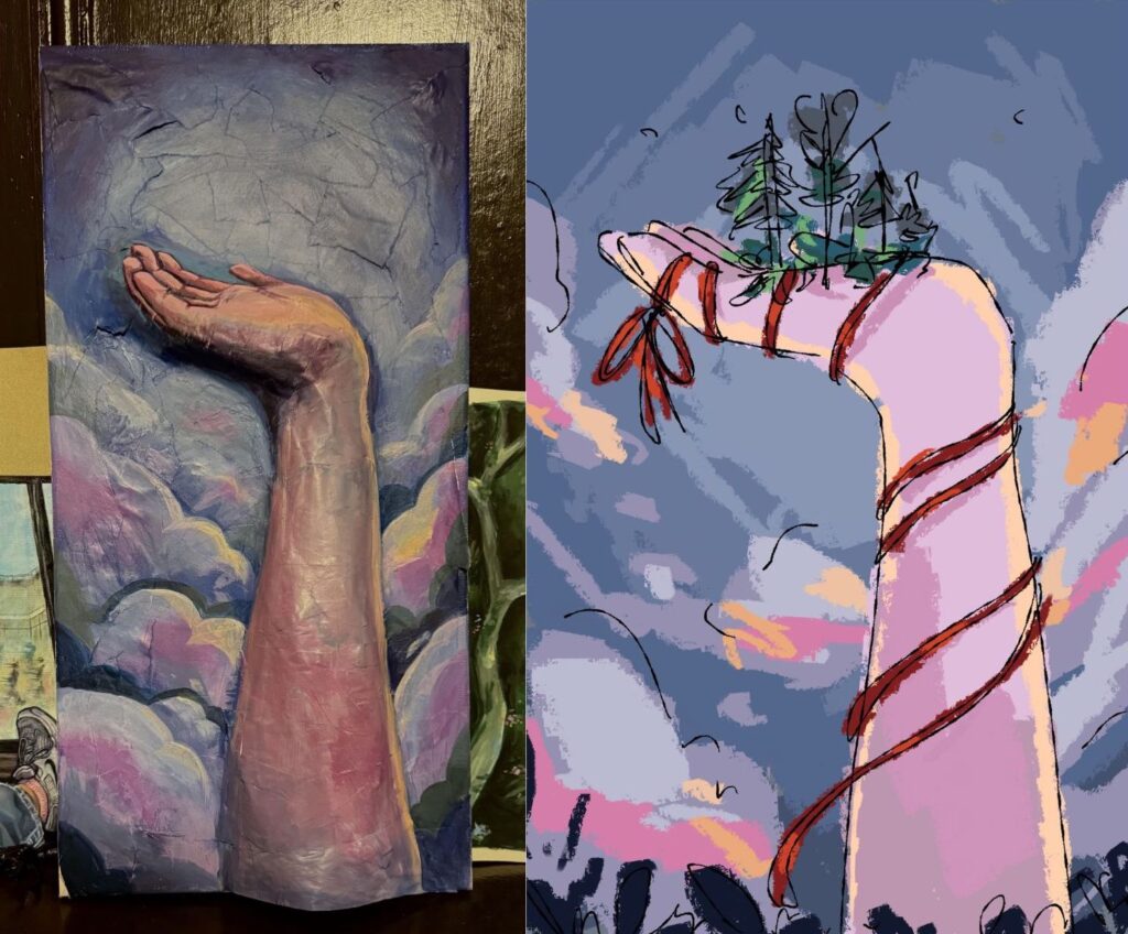 He received only a draft of what Kordit envisioned — then, just a foregrounded arm holding nature in the palm of its hand, surrounded by dark clouds.