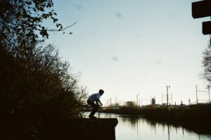 The sun and train had woken up neighbors that I didn’t know I had. Across the river, a half dozen people were stirring in sun-faded tents set up above the abutment of the old bridge. A woman tidying up the camp dumped the night’s refuse into the river, and the smell of urine drifted upstream.