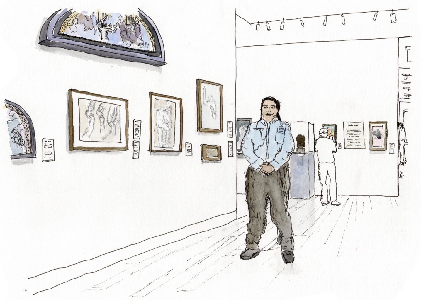 Guarding the gallery seemed like a good gig to pair with the degree. Despite the large amount of standing involved, quite a bit is enjoyable. “I can look at what others before me did,” Fernando says, palms folded and feet planted wide beneath John Singer Sargent’s study of clasped hands.