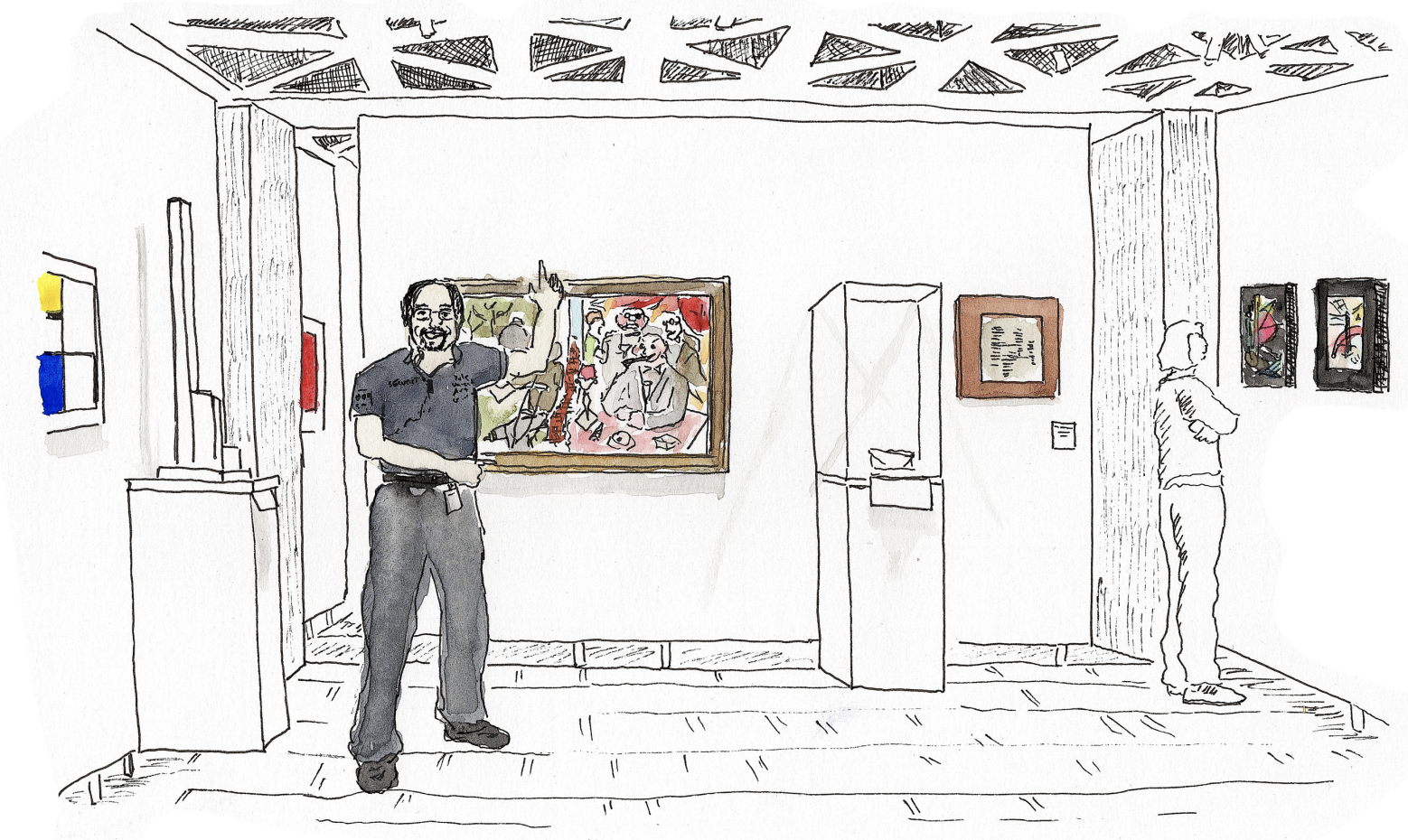 Jeremy has a verdict, a theory for everything –– including his favorite works in the gallery. He whisks me to his spot. “It’s a corner, three paintings, done by different artists at different times, but they talk to each other.”