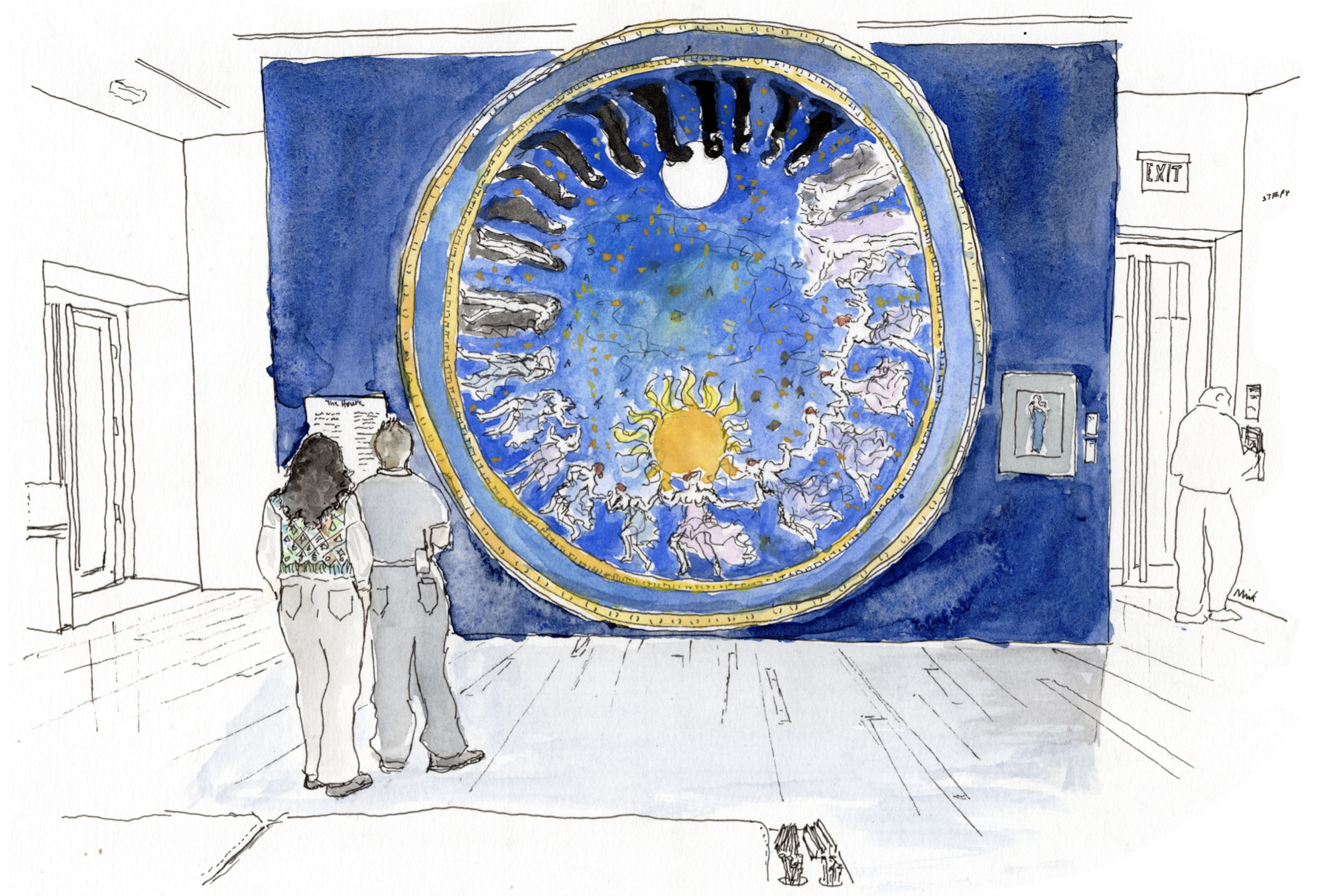 On my second visit to The Dance of Life, I turned into the final room to see Jeremy, dwarfed beneath the massive circular canvas. Six feet above him, hunched masculine figures cloaked in black march along the top of the frame towards twirling women, draped in loose pastel tulle. Behind the women, long golden rays of a sun stretch outward. Behind the men’s cloaks, a smaller silver moon glows. Against the dark blue sky, a thick spread of golden stars lights the whole scene.