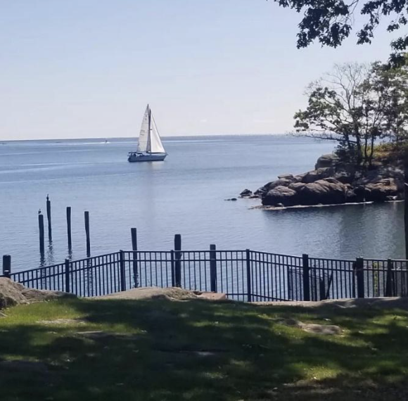 A sailboat passing Connecticut Hospice in the summer. During peak season, more than twenty sailboats can be seen floating through the water at a time.