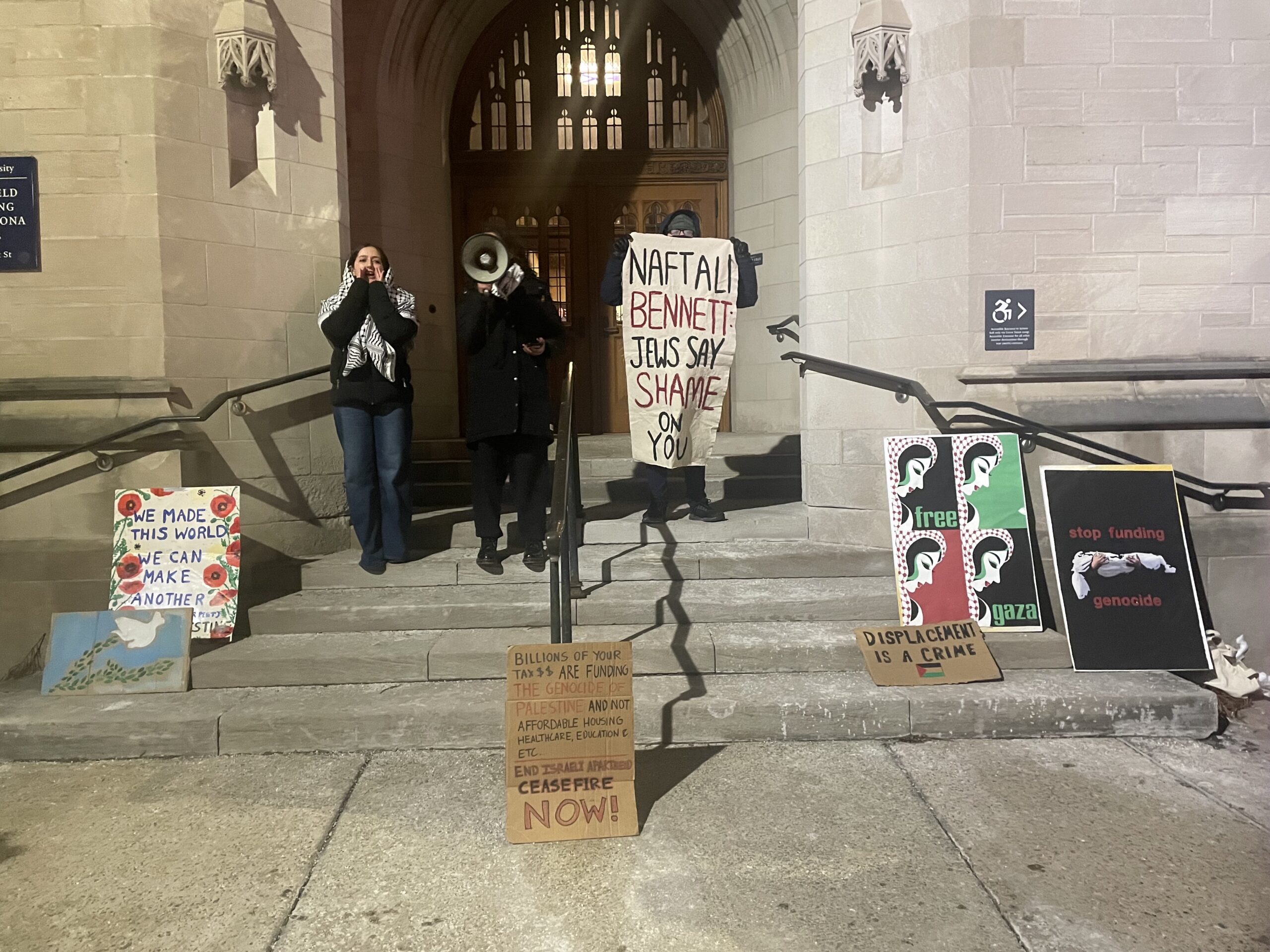 “We wanted Naftali Bennett to hear our voices and know that we as Jews reject his hateful rhetoric and harmful policies towards the Palestinian people,” said Hannah Krenn ’25, an organizer of the singing circle.