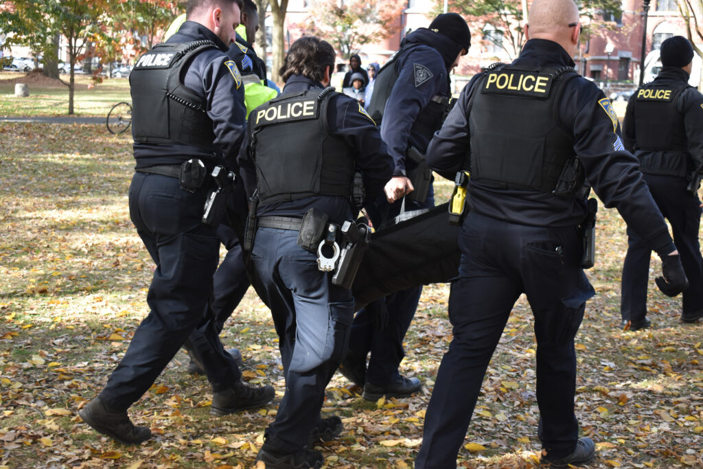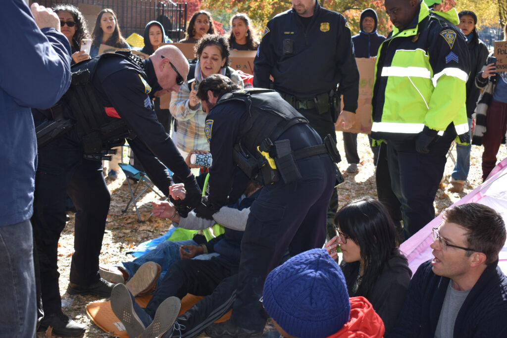 As the first arrest was made of Colville, U-ACT’s lead organizer, protesters chanted, “Where then shall we go,” which has been the question guiding the encampment since its establishment. Other chants included, “Displacement is a crime from New Haven to Palestine” and “Fund housing, defund police.”