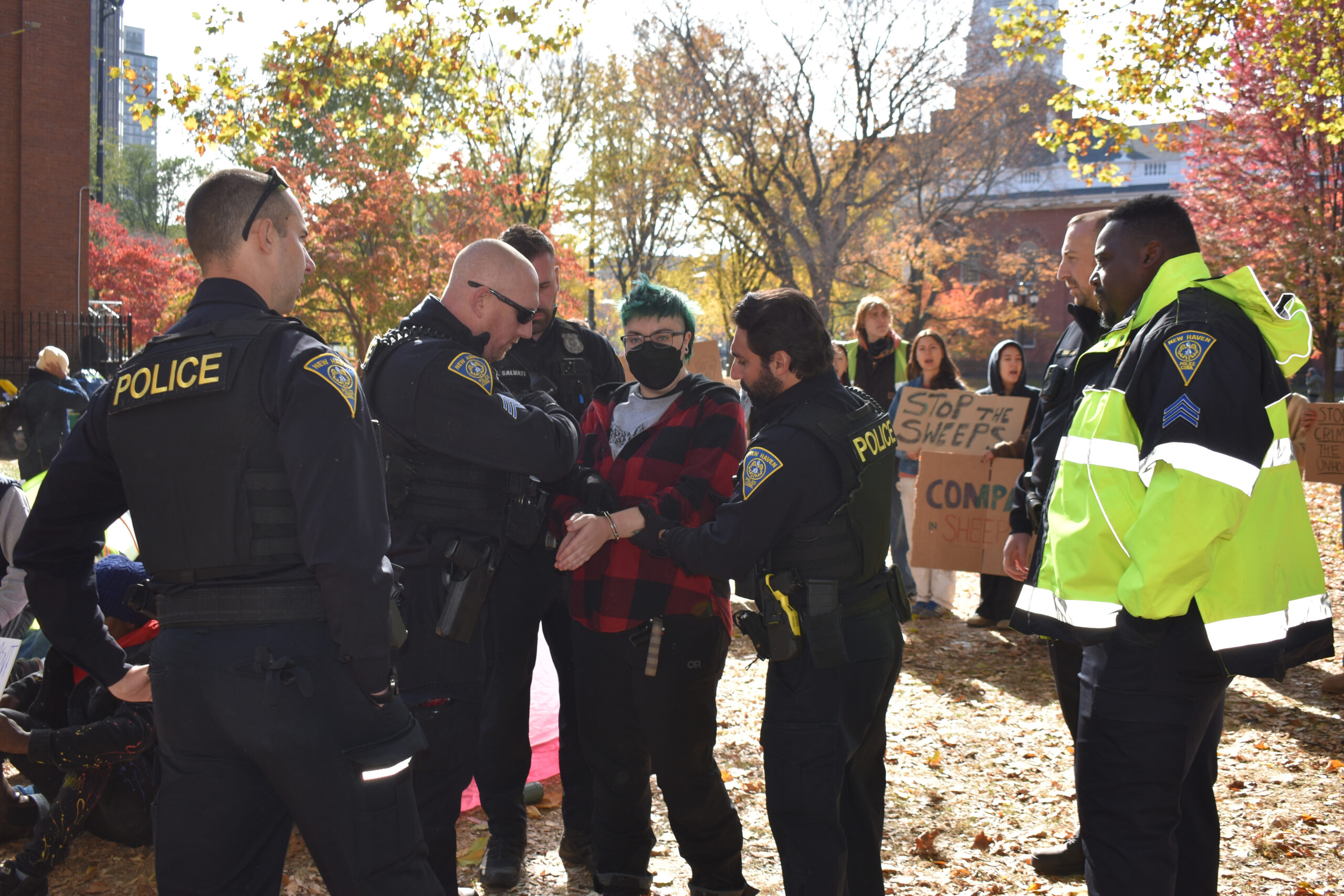Monday’s arrests came shy of two weeks after the encampment’s erection when organizers first put up tents on the Green. Before Monday’s arrests, New Haven housing outreach officials had offered beds in shelters and other support services. NHPD made clear to participants that tents are not allowed on the Green, and organizers took them down after the first night so that they could maintain their occupation of the space.