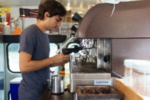 The Jitter Bus took the first step to prioritize their product by choosing exactly where their coffee came from. “We picked two local roasters in Connecticut and we don’t use any coffee that is not organic or Fair Trade,” Dan said. They made their choice after a long and arduous search process. Even before they had a bus, they visited Saccuzzo Coffee, a roastery in Newington, Connecticut. They also met Jeff, the owner of Giv Coffee in Canton, Connecticut, who started out of his garage but now has his own café. Ultimately the founders decided to go with both suppliers. “They were both so good, it was impossible to choose,” Dan said with a smile.